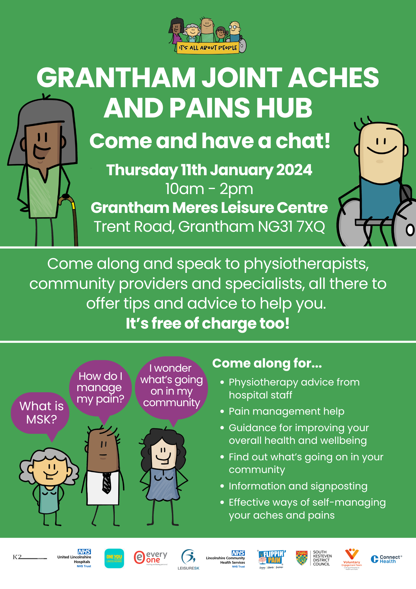 "The first of these pop-up health hub events, Grantham Joint Aches and Pains Hub, took place at Grantham Meres Leisure Centre on 11 January 2024. This event brought together representatives from GP surgeries, Grantham and District Hospital, One You Lincolnshire, community physiotherapists, pain management services, Lincolnshire County Council, the charity sector, South Kesteven District Council, Citizens Advice South Lincolnshire, and many more services and organisations.