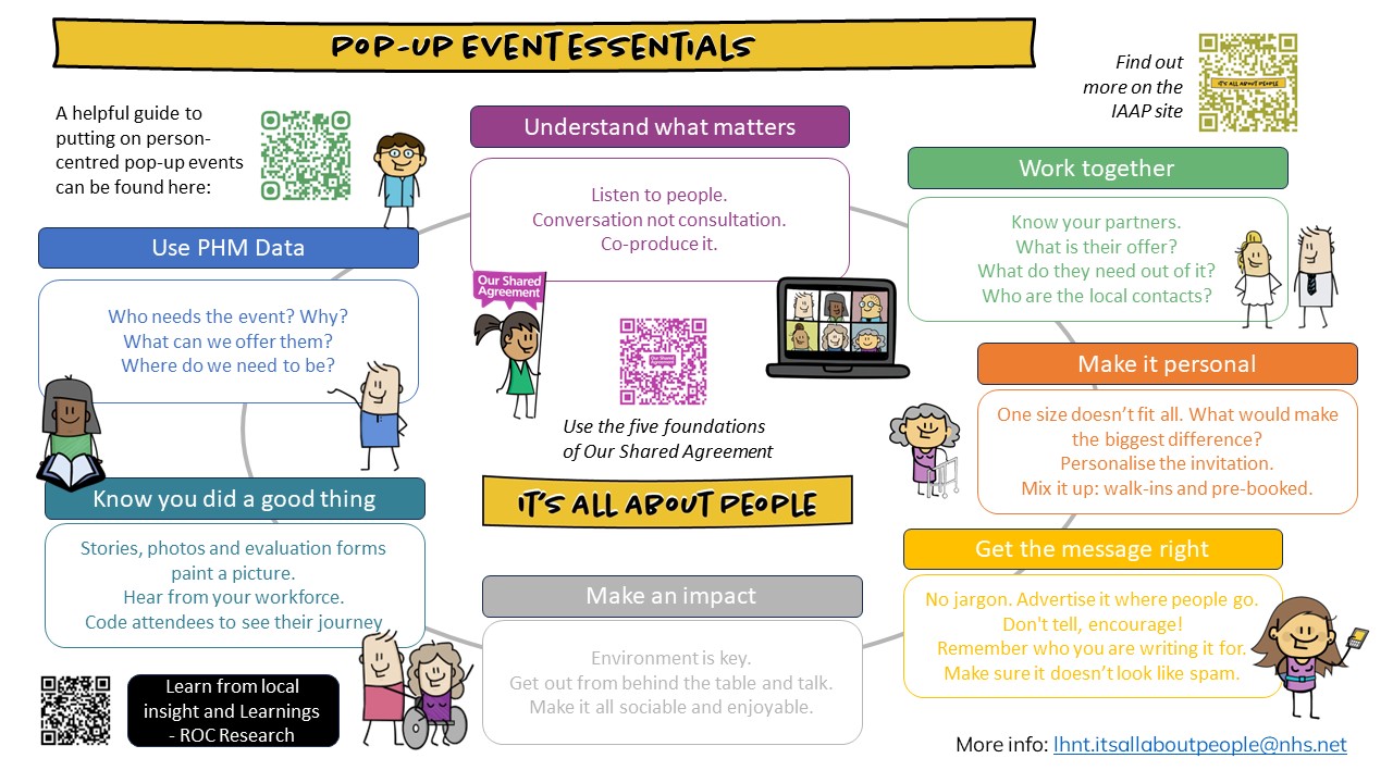 This guide, which is available to download from the right-hand panel of this page, supports colleagues across Health and Care to consider seven key principles (see the diagram below) to develop and host a successful pop-up event.